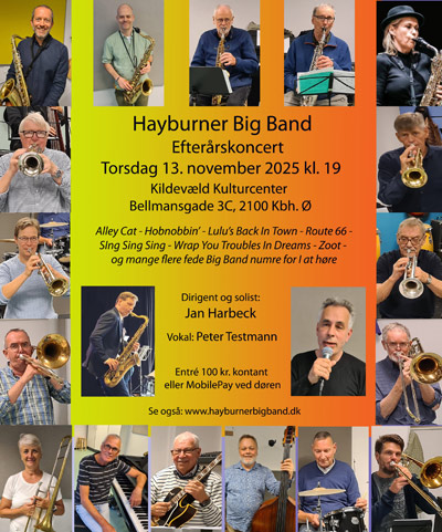 Alley Cat - Hobnobbin’ - Lulu’s Back In Town - Route 66 - Sing Sing Sing - Wrap You Troubles In Dreams - Zoot - og mange flere fede Big Band numre for I at høre til denne svingende efterårskoncert.